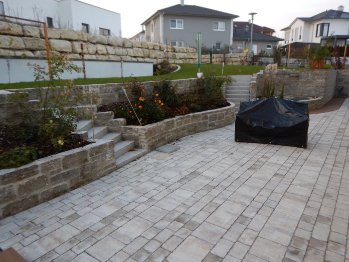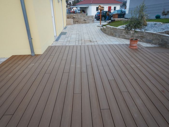 Terrassen können aus verschiedensten Materialien hergestellt werden z.B. Holz, Platten, Pflaster.